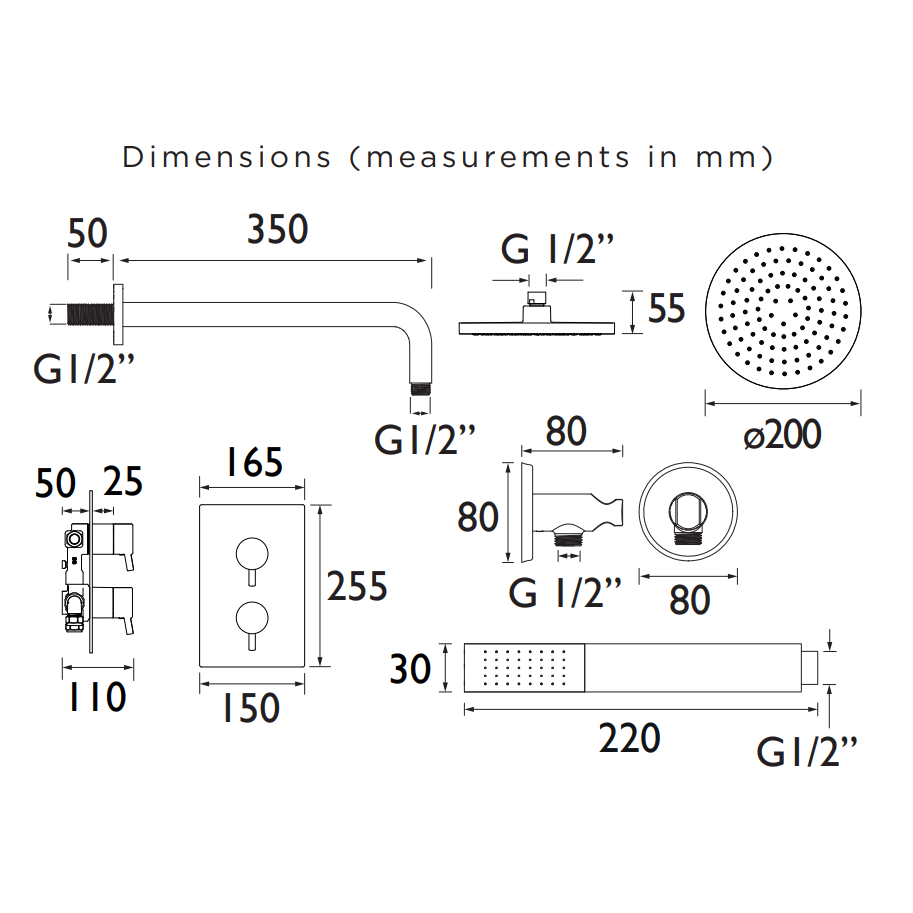 ✔ All-in-one pack — Includes a shower valve with an integral two-outlet diverter, a slimline 200 mm round drench head with shower arm, and a rub-clean single-function handset with wall outlet.