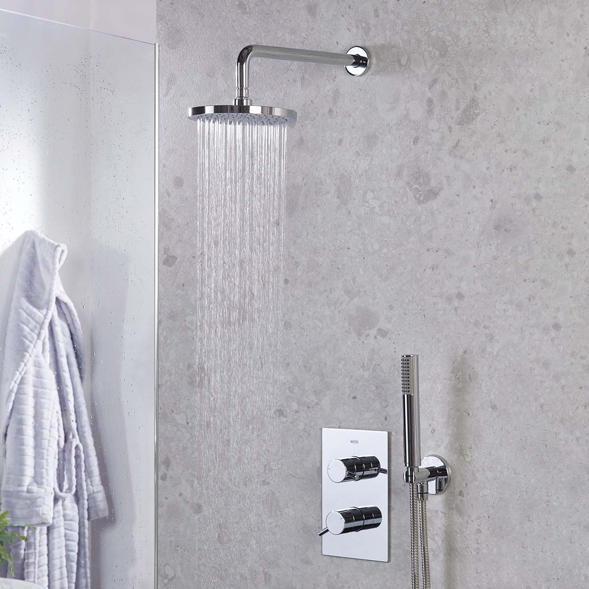 Sleek and contemporary in design, this shower system offers fingertip-touch practicality that’s effortless to use and easy to clean. The all-in-one pack includes a shower valve with an integral two-outlet diverter, a slimline 200mm round drench head with shower arm, and a rub-clean single-function handset with wall outlet. Both the handset and drench head feature rub-clean nozzles, allowing limescale and debris to be wiped away quickly and easily. Installation is simple thanks to an adjustable faceplate that fits wall depths from 50mm to 75mm for a perfectly flush finish, while the integral diverter enables smooth switching between the handset and drench head. A thermostatic cartridge with a preset 42°C safety stop ensures family-safe showering, with an override available for higher temperatures if required. Dual controls provide precise, independent management of flow and temperature, and the cartridge is accessible from the front for easy servicing. For added safety, the system automatically shuts off in the event of hot or cold water failure. Finished with a durable metal backplate and handles, along with a scratch-resistant, salt-spray-tested chrome coating, it’s built to last. For peace of mind, it comes complete with a 5-year parts and 1-year labour guarantee.