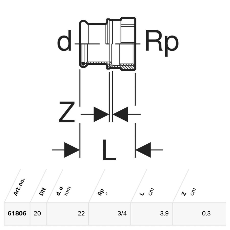 2. Features of Geberit Mapress Copper Adaptor with feMale Thread: CC499K, d=22mm, Rp=3/4" - 61806: