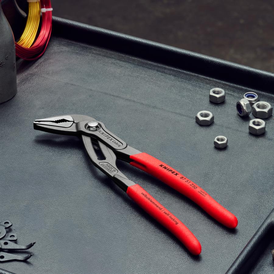 87 51 250 KNIPEX Cobra® ES Particularly good access to the workpiece due to very slim construction of head and joint area. Long, narrow jaws with front gripping serration: longitudinal gripping profile for round parts such as screws and bolts. Ideal for service, maintenance and equipment repair, in automotive and general industry. Firm grip also on flat material due to three-point rest. Cross groove for holding slender round materials such as nails. Fine adjustment for optimum adaptation of the gripping capacity and ergonomic grip position. Push the button for adjustment on the workpiece. Self-clamping on pipes and nuts: no slipping on the workpiece, effortless working. Box-joint design for high stability due to double guide. Reliable catching of the hinge bolt: no unintentional shifting. Pinch guard prevents operators' fingers being pinched. Fine adjustment for optimum adaptation of the gripping capacity up to width across flats of 36 and pipes up to ? 40 mm. - Adjustment positions: 19- Capacities for nuts: Ø 1 1/4in- Capacities for nuts: 34mm- Capacities for pipes (diameter): Ø 32mm- max. parallel opening width: 37mm- max. gripping depth: 42mm