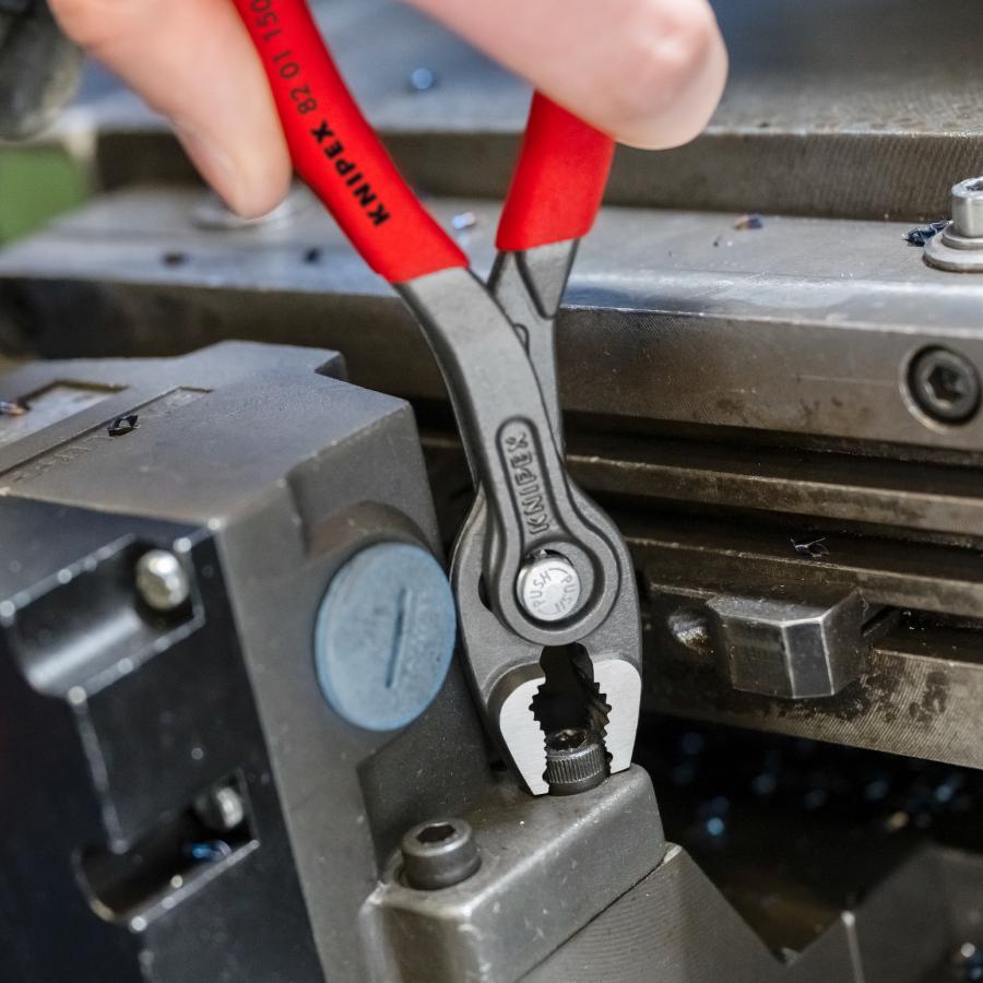 82 01 150 KNIPEX TwinGrip® Gripping, tightening and loosening screws with worn heads and threads. Unique combination: Front grip and side grip function, box joint, push button adjustment. High-grip front jaw with robust teeth and high gear ratio at the tip of the mouth. Very slim pliers: work even in confined spaces, with slim turning zone for fast screwing. Optimised geometry of the side jaw design: with locking effect for maximum grip when loosening and tightening. Pinch stop reduces the risk of crushed fingers. Durable and resilient thanks to robust box joint. Small and handy – also suitable for more delicate work. Large front and side gripping capacities: for diameters and width across flats 3 – 16 mm. Reliable, frontal gripping of flat workpieces up to 6 mm thanks to three-point system. Three-way adjustable slip joint with push button adjustment for precise alteration of gripping capacity. - Adjustment positions: 3- Capacities for pipes (diameter): Ø 3 – 16mm- Capacities for nuts: 3 – 16mm